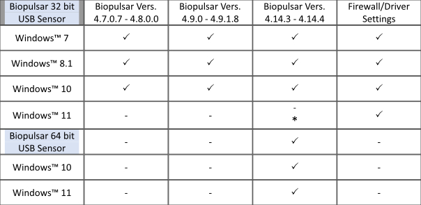 * Depending on the update, the 32 bit Biopulsar sensor may still work under Windows 11 , but with limitations. Basically, Windows™ 11 is not a stable platform for the older 32 bit sensor and is therefore not recommended. Further updates can make the Biopulsar system increasingly unstable or even completely deactivate it.
